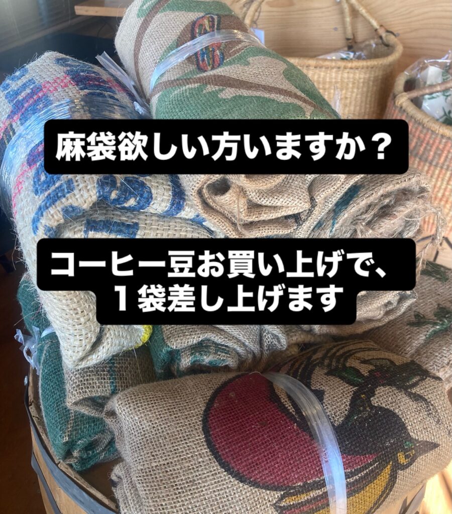 コーヒーの麻袋って結構かわいい柄が多いですよね。見たこともない方もいるかと思いますが、コーヒーで各国の雰囲気を感じられます。でも私には使い道がありません。欲しい方がいれば、コーヒー豆お買い上げの方に1袋差し上げます。庭のプランターに巻き付けたり、家庭菜園の道具入れ、キャンプの汚れ物入れ、生地の良いものはエコバックに改造したりしている人もいるみたいです。