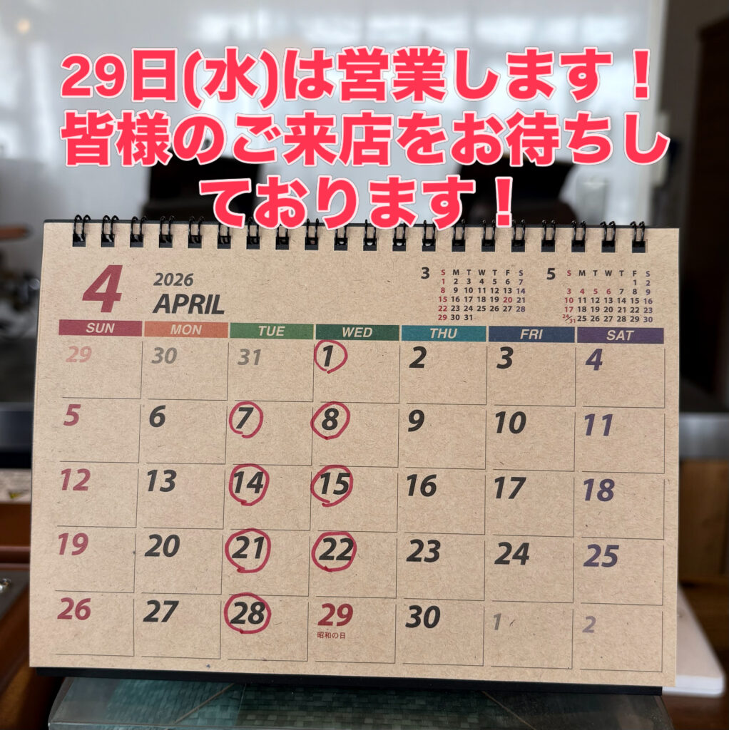 4月のお休みです。29日(水)は祝日なので通常営業です。改めてゴールデンウィーク期間中の営業日はお知らせします。